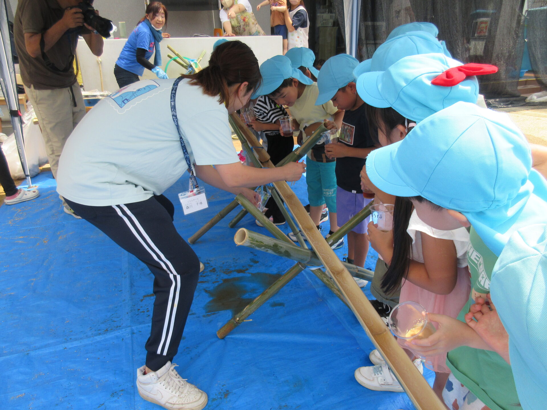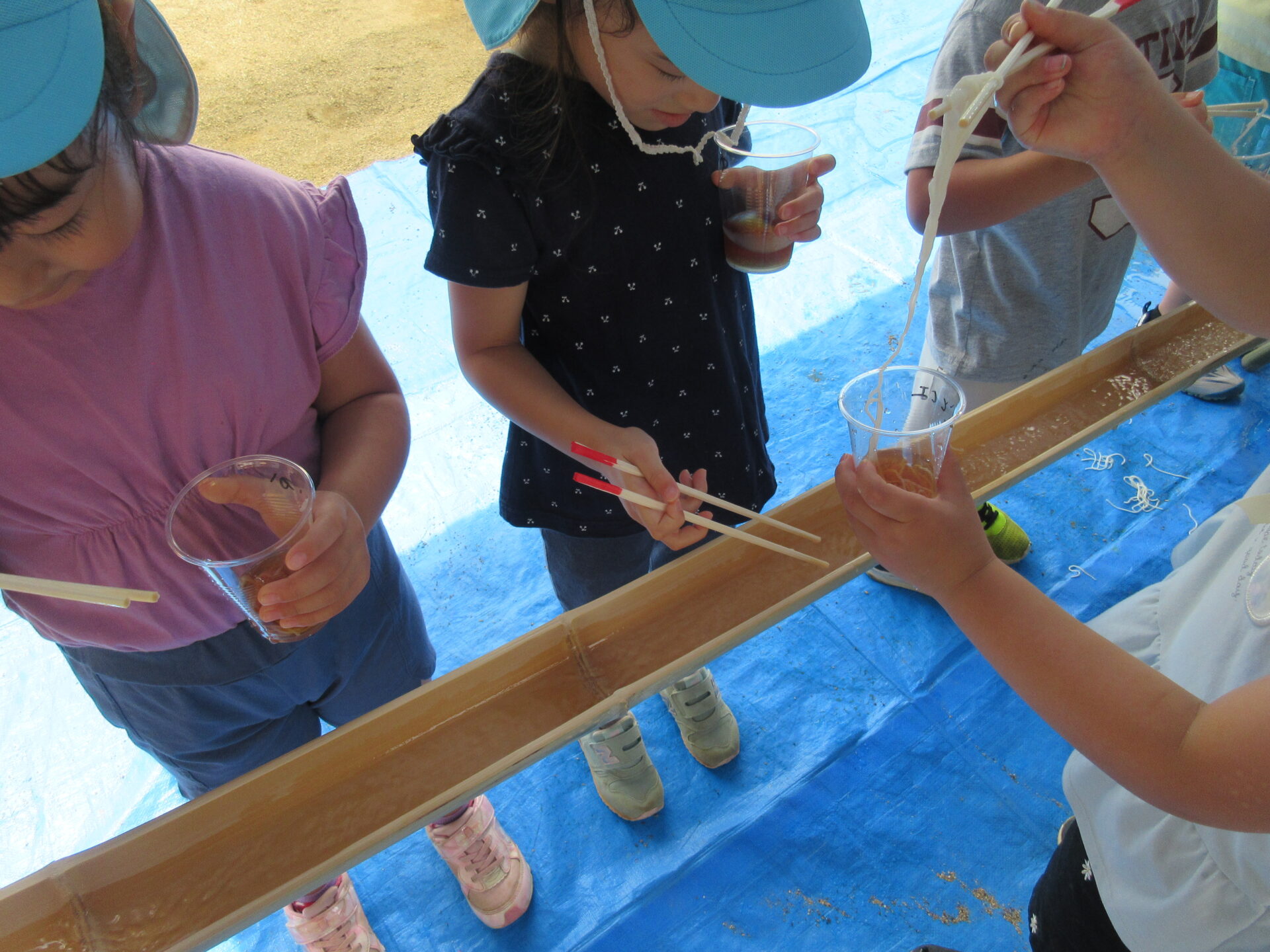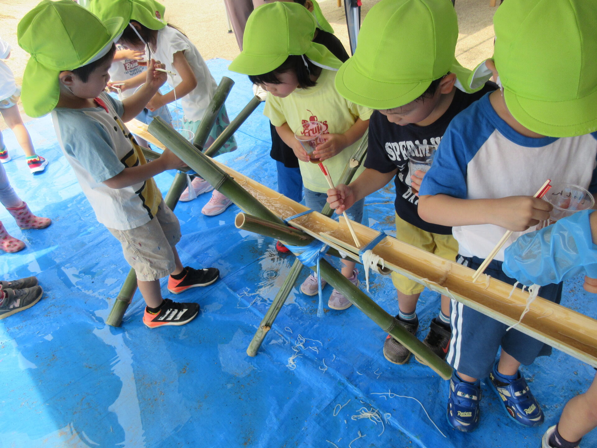 くじらちーむが竹を使って流しそうめんの水路を作り、流しそうめんをみんなで行いました。