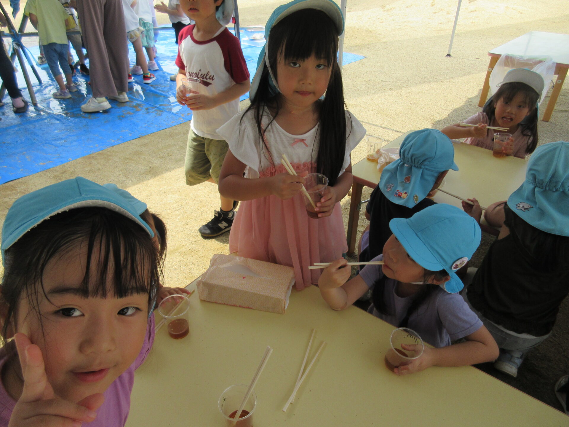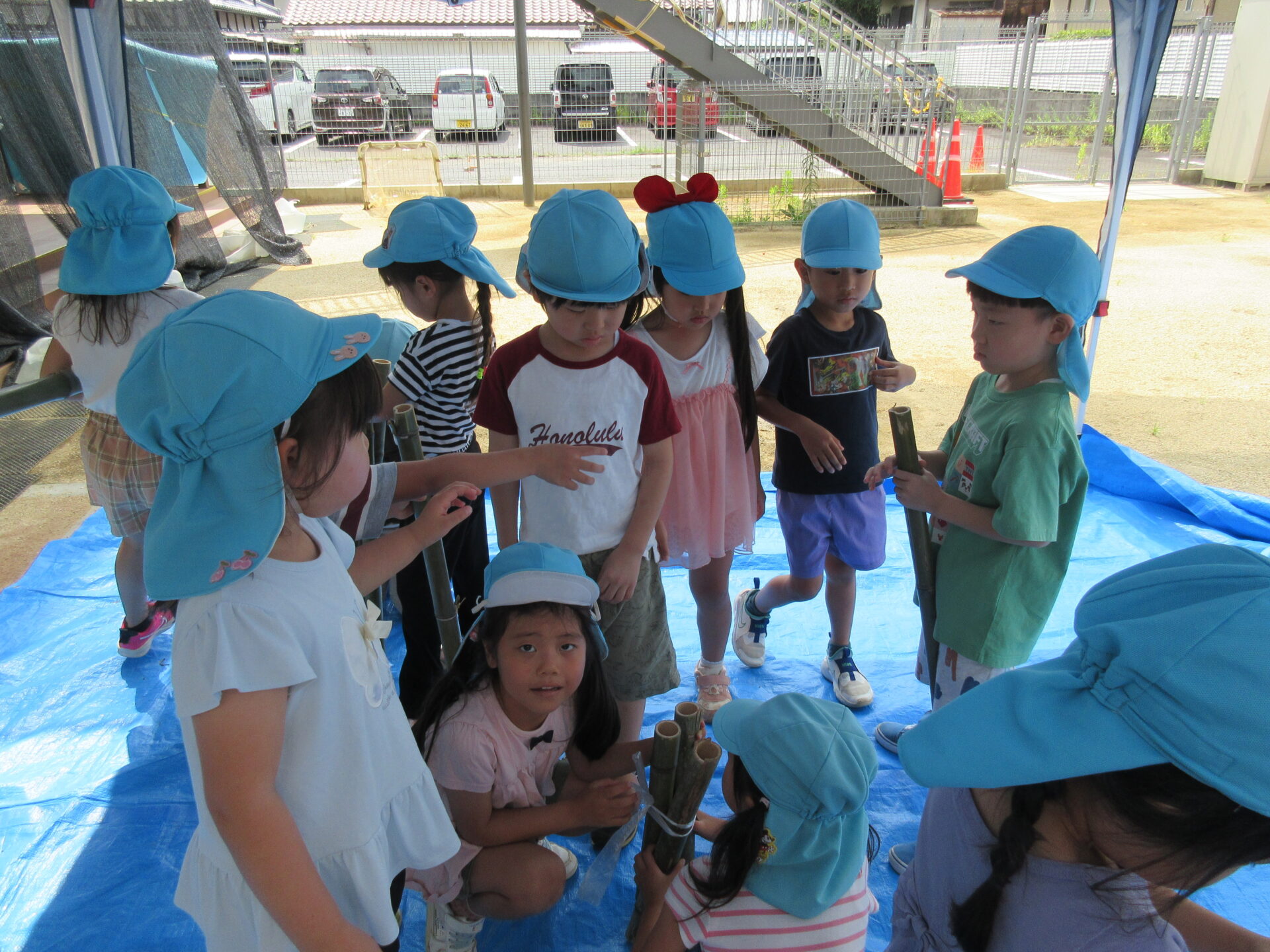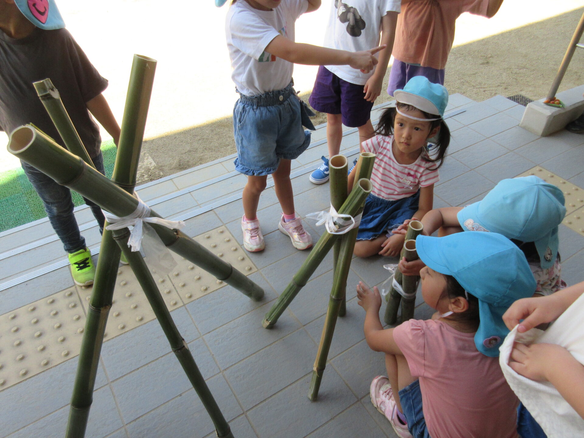 くじらちーむが竹を使って流しそうめんの水路を作り、流しそうめんをみんなで行いました。